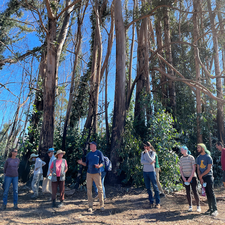 Pie Ranch co-founder Jered Lawson orients volunteers for a “Euc-a-thon,” a community event to help remove eucalyptus saplings in October 2021. Eucalyptus trees added fuel to fire in 2020. Photo by Sara Hayden. This is what a group of volunteers came to grapple with for the farm’s “Euc-A-Thon,” a walk-a-thon-style fundraiser focused on pulling up eucalyptus saplings. One goal was to help remove invasive, flammable trees that propagated in the wake of the fires.